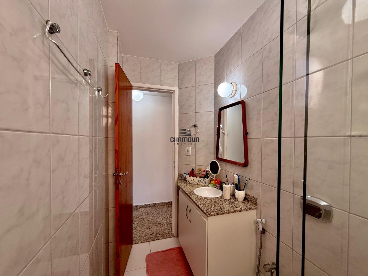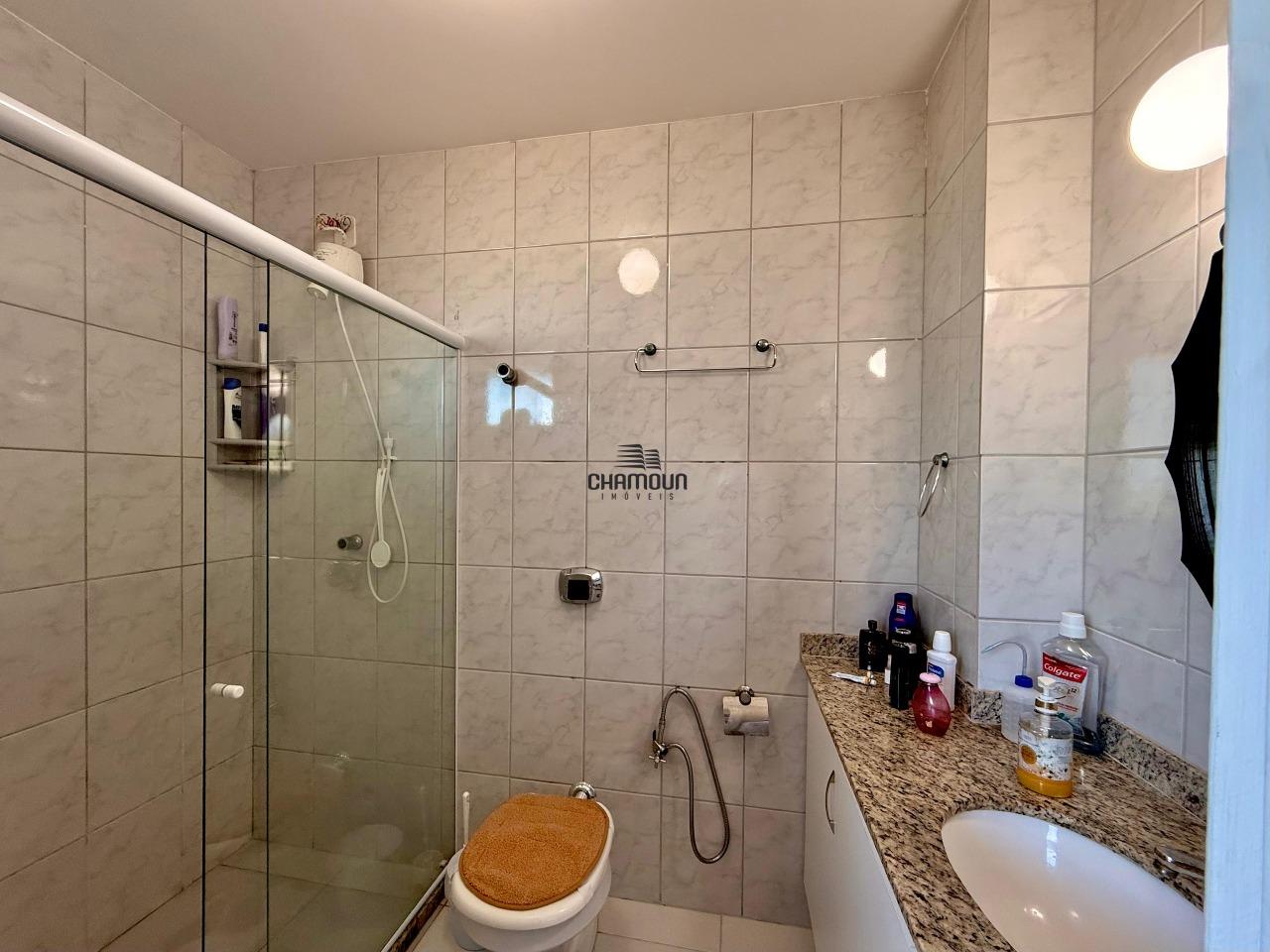 Banheiro social com box em vidro e armário;
