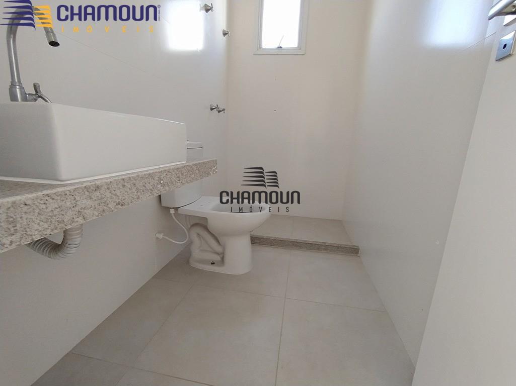 Banheiro social com box em vidro e armário;