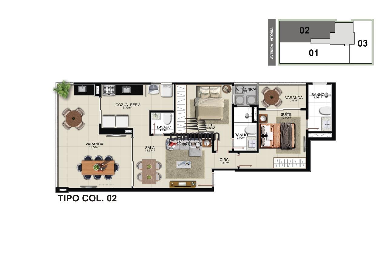 Apartamento com 2 quartos, sendo 2 suítes, 2 vagas de garagem, sala de estar, sala de jantar, varanda, banheiro social, cozinha, área de serviço.