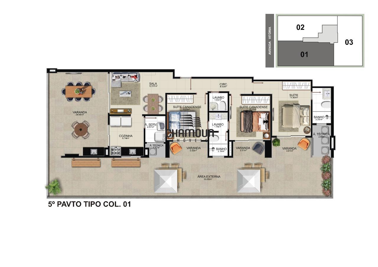 Apartamento com 3 quartos, sendo 1 suíte, e 2 suítes canadenses, 2 vagas de garagem, sala de estar, sala de jantar, varanda, banheiro social, cozinha, área de serviço.